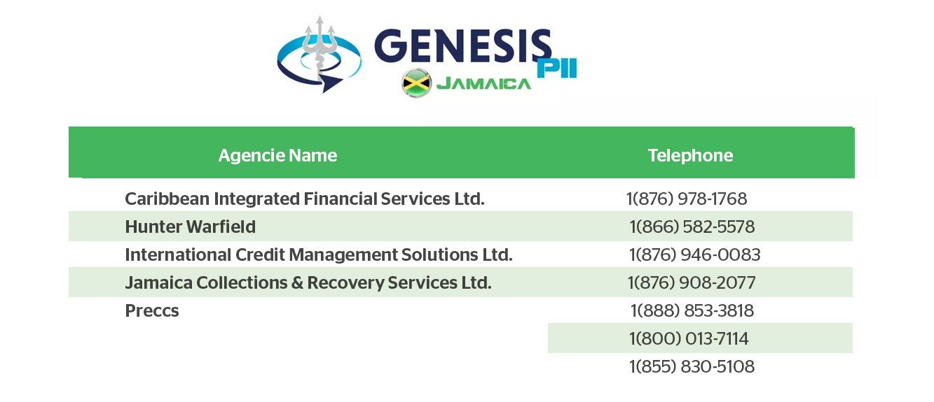 2. Directly in our bank account through Scotibank Bill Payment Services. You just need to select GENESIS PII JAMAICA from the list of registered providers and use your loan number/personal identification number as a reference. ![]()