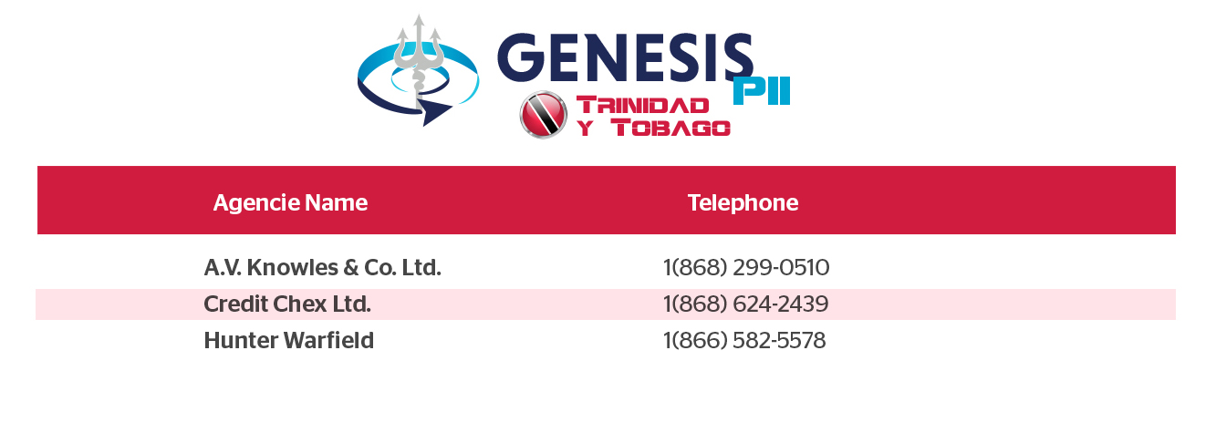 2. Directly in our bank account through Scotibank Bill Payment Services. You just need to select GENESIS PII TRINIDAD from the list of registered providers and use your loan number/personal identification number as a reference. ![]()